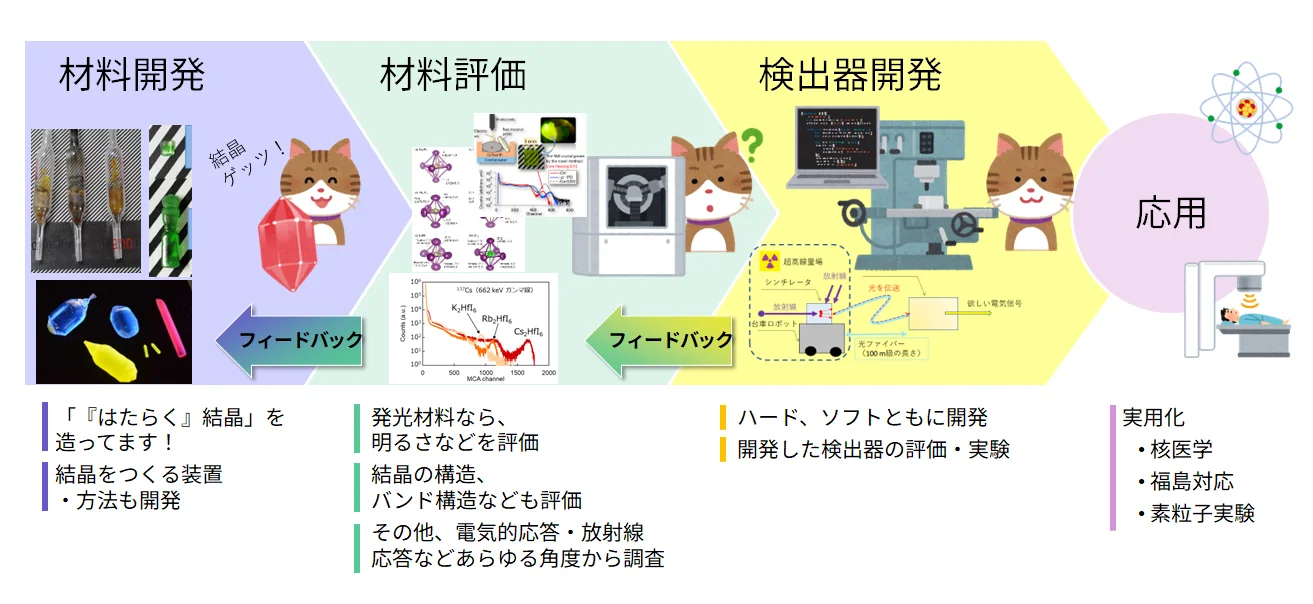 エネルギー量子工学講座は、革新的な放射線検出装置、手法の開発を素材開発から垂直統合的に、かつ、他分野との融合による水平思考により進めており、環境モニタ、核医学そして基礎物理実験への実用化を進めています。